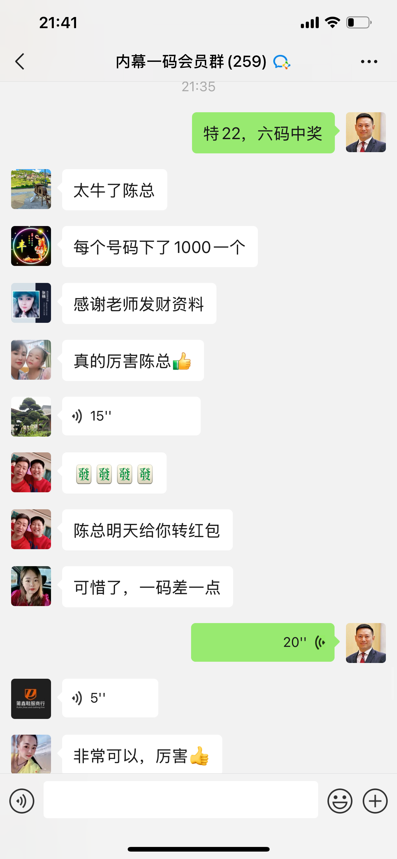 陈总你的资料太准了,昨晚中的钱刚从庄家那里拿回来,没找你之前输了十几万了,昨晚总算中回来一点了,以后就跟着你赚钱了。红包少不了你的,等我还清债务就发大红包感谢陈总!